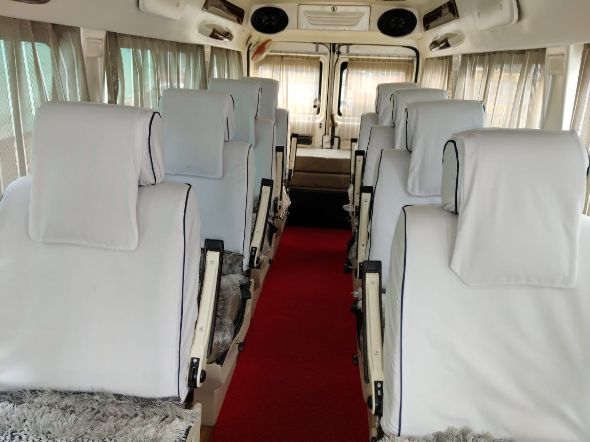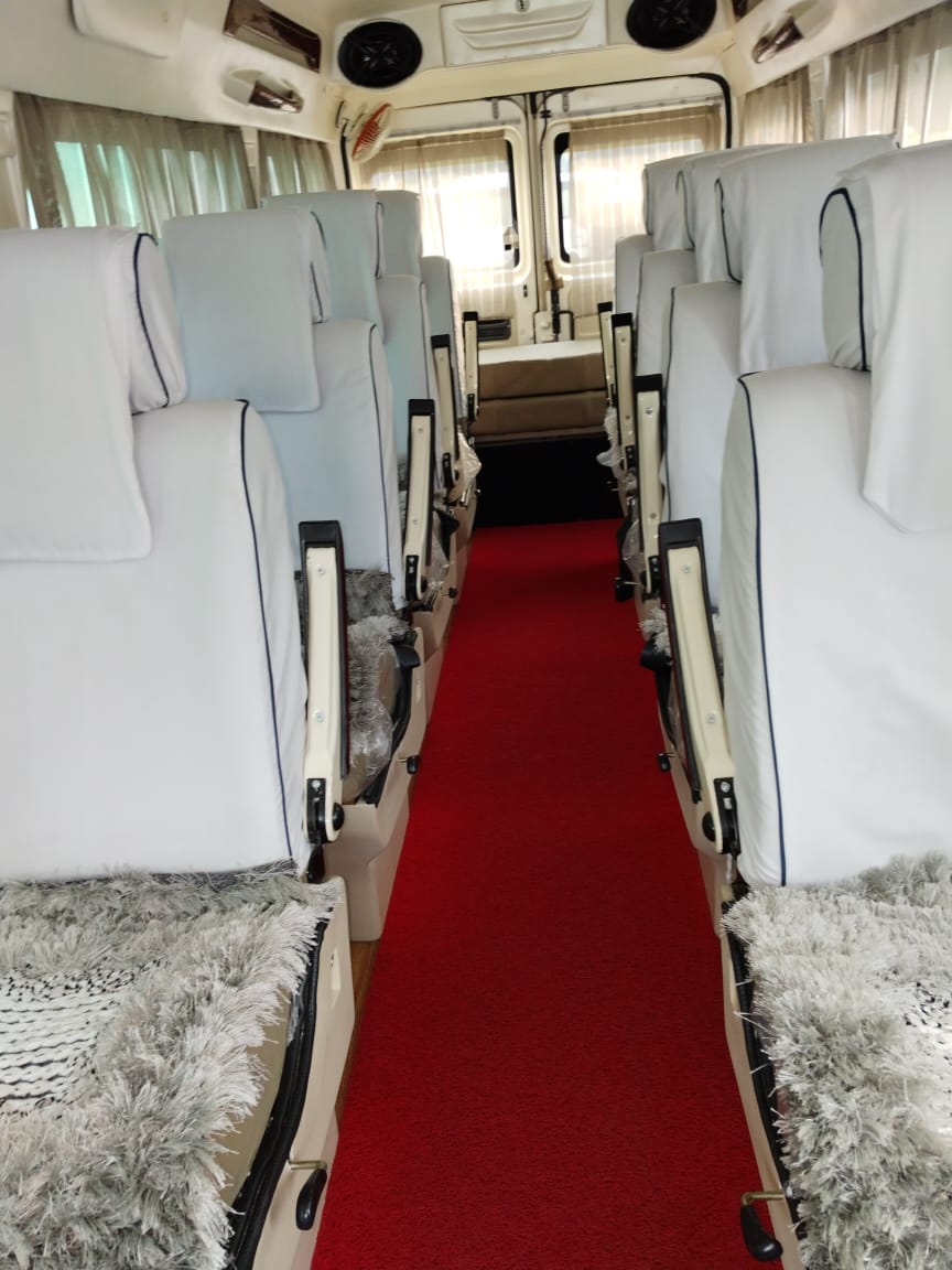 Tempo Traveller is a kind of mini bus comes with 10, 12, 15, 17 and 20 seating capacity with air-condition(AC) and recliner seats for a comfortable journey. Hire Our 9 Seater and 12 Seater Maharaja Tempo Traveller (1x1 Maharaja recliner Seat)